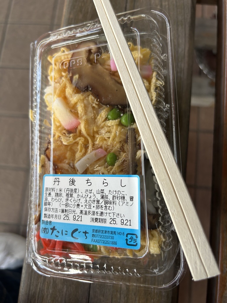 途中のサービスエリアにトイレ休憩で立ち寄った際に、朝市が開かれており、丹後名産の「ばら寿司」を買いました!これで350円はお買い得!!