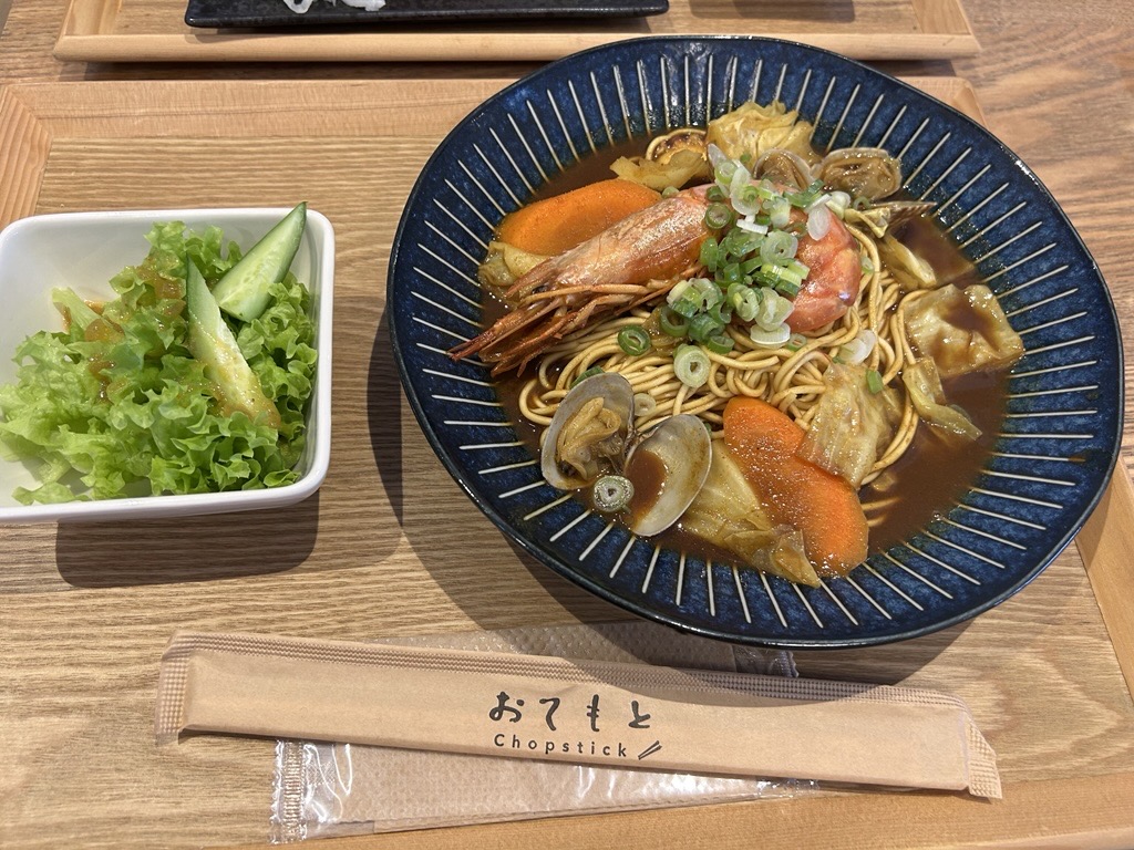 お昼ご飯は、せっかく丹後なので、海鮮をイメージしていたのですが、調べてみると「宮津カレー焼きそば」なる刺激的な単語を発見!すかさず提供してもらえるレストランを検索、訪問しました。道の駅にあったのでそちらのレストランでいただきます。