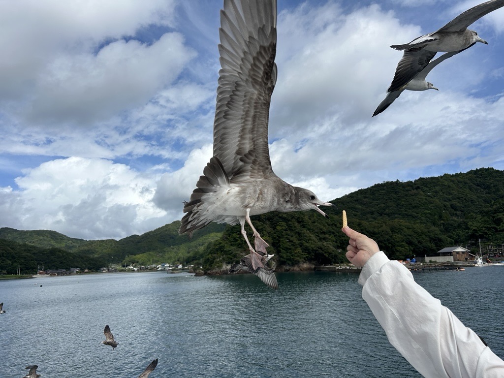 前半は、カモメの餌付け体験、後半は、美しい伊部湾の舟屋を見学する素晴らしいクルーズでした。