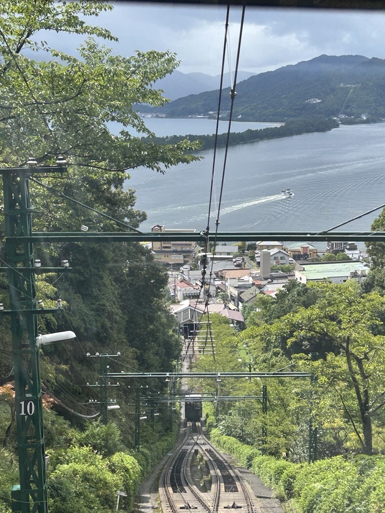 下船し、クルーの皆さんへお礼をお伝えし、再びドライブで天橋立に向かいます。30分ほどで到着。駐車場に車を止め、ケーブルカーを待ちます。