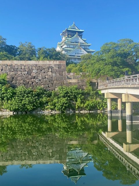 朝日を浴びてお濠に映る大阪城はいいものです。