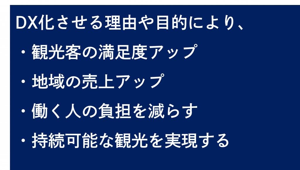 観光・旅行業・地方自治体の課題や問題をデジタルの力を借りて、運営者や利用者の利便性、効果・効率を高め、運営側の省人化をして解決すること。かし、DXの力をかりて、観光・旅行の何にどう活かし、役立たせることが出来るのか?